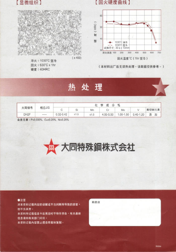 簡要描述:日本大同DH2F(40HRC預硬級)熱作模具鋼:預硬易切削熱作模具鋼(40HRC)...